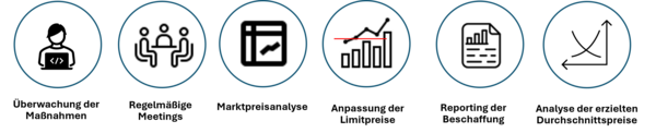 Die Überprüfung und Marktanalyse umfasst regelmäßige Meetings zur Marktpreisanalyse, Anpassung der Limitpreise, Reporting der Beschaffung und Ermittlung der Durchschnittspreise